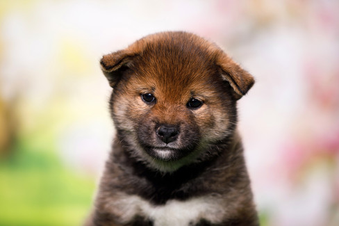 A new litter of shiba puppies. There is a black-and-tan male, a black-and-tan female and three sesame females in the litter.